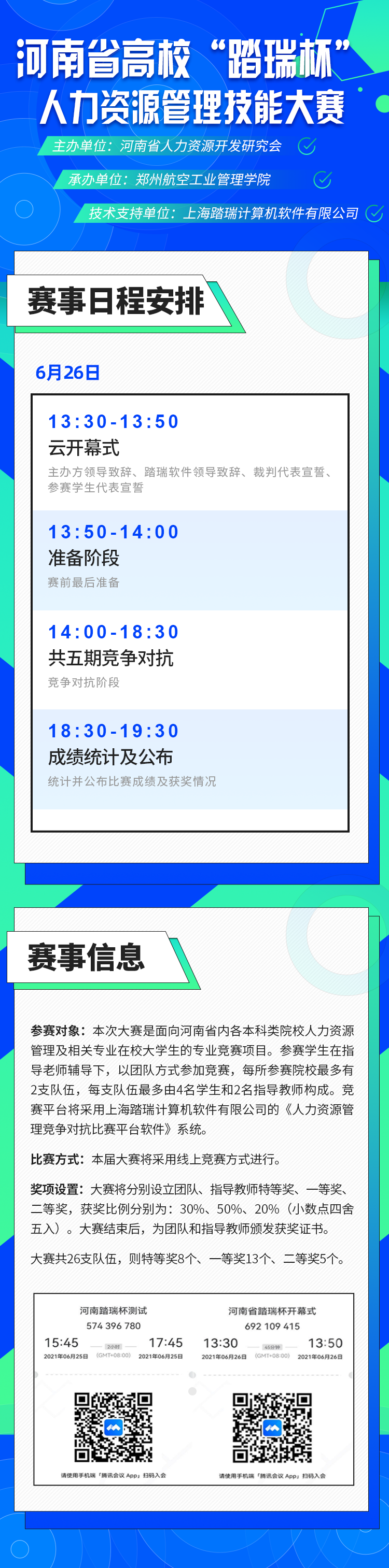 由河南省人力資源開發(fā)研究會(huì)主辦、鄭州航空工業(yè)管理學(xué)院承辦、上海踏瑞計(jì)算機(jī)軟件有限公司技術(shù)支持的第一屆河南省高校“踏瑞杯”人力資源管理技能大賽將于2021年6月26日正式開賽。