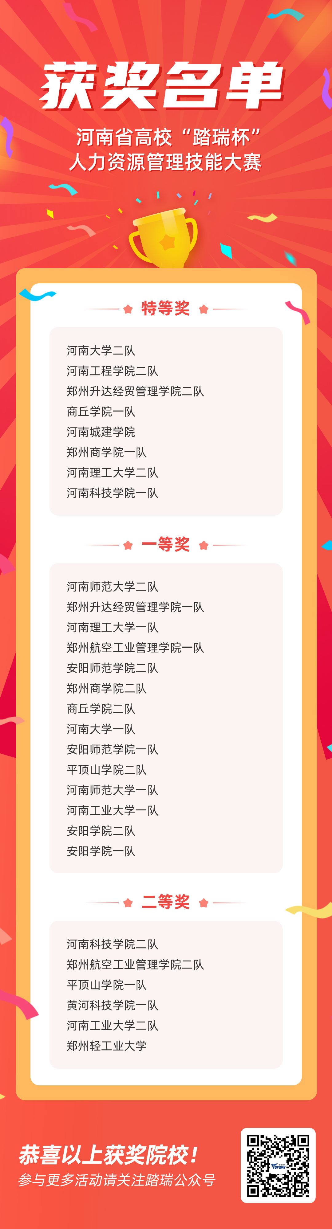 比賽結(jié)束后,踏瑞大賽組委會(huì)本著公平公正的原則,核算各個(gè)高校的成績并進(jìn)行審核,最終8支隊(duì)伍獲得特等獎(jiǎng),14支隊(duì)伍獲得一等獎(jiǎng),6支隊(duì)伍獲得二等獎(jiǎng),附獲獎(jiǎng)名單見下圖。