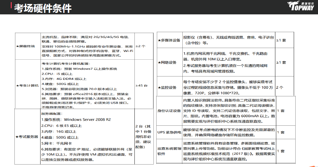 計(jì)算機(jī)配置: 1.操作系統(tǒng):預(yù)裝Windows7以上操作系統(tǒng) 2.CPU:i5或以上 3.內(nèi)存:4G DDR4或以上 4.硬盤(pán):500G或以上 5.瀏覽器:預(yù)裝谷歌瀏覽器70.0版本或以上 6.其他要求:預(yù)裝office2016版本或以上,預(yù)裝全拼、簡(jiǎn)拼、微軟拼音等中文輸入法和英文輸入法。必須卸載或關(guān)閉還原卡/保護(hù)卡,必須關(guān)閉USB接口。不推薦使用筆記本。 |