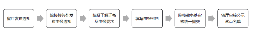 首先教育部會(huì)向各省教育廳下發(fā)相關(guān)文件通知,省教育廳向各院校下發(fā)有關(guān)試點(diǎn)工作的通知,一般學(xué)校教務(wù)處會(huì)向各院系下發(fā)申報(bào)通知,各專業(yè)根據(jù)自身情況進(jìn)行證書(shū)申報(bào)。