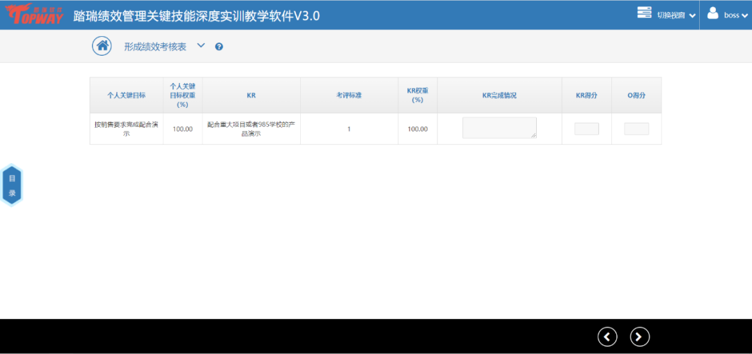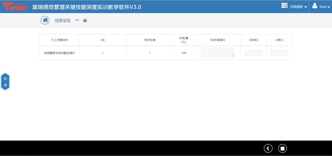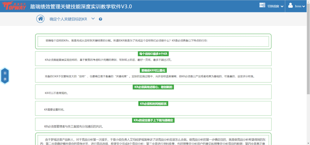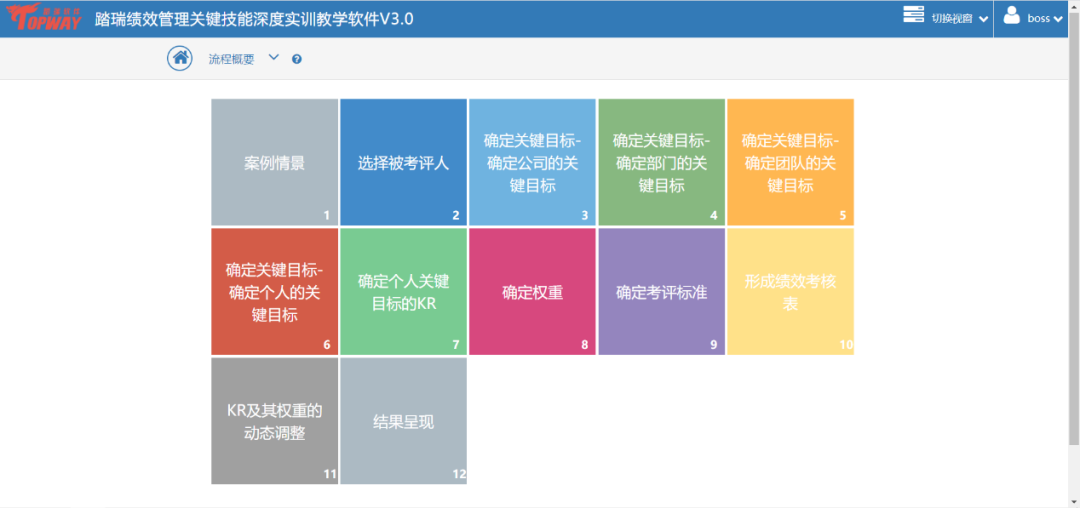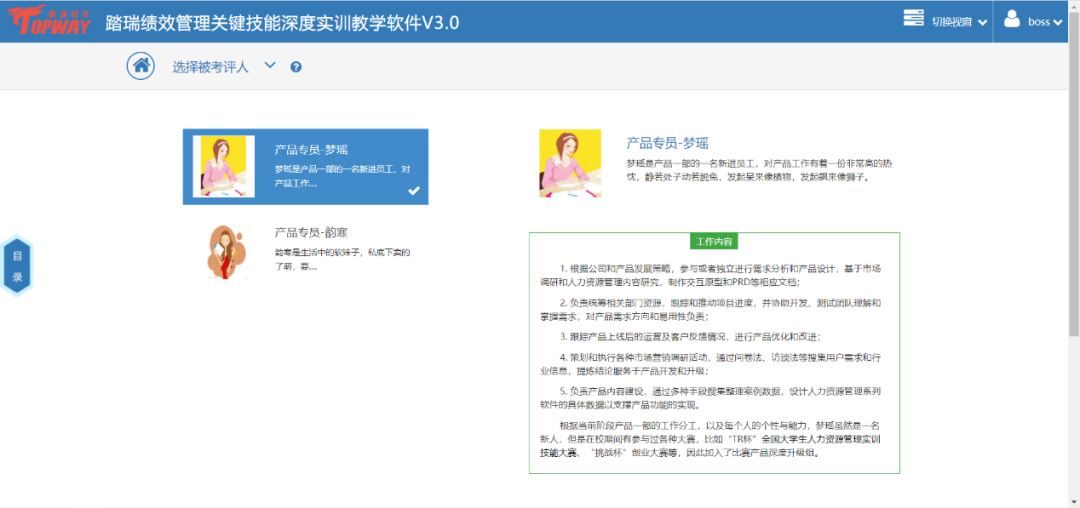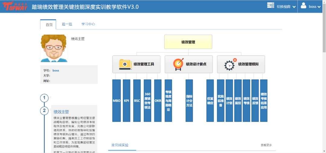 踏瑞績效管理智能反饋比賽軟件是一款緊密結合理論知識和工作實踐的績效管理課程實訓軟件。通過軟件,學生不僅能夠深度訓練常用的績效管理工具,還可以了解和練習新興的績效管理工具,例如OKR等。此外,學生還可以對績效設計要點進行充分訓練,對績效管理流程進行PDCA全過程綜合模擬。充分地將理論知識與績效管理工作的方法、工具和流程相融合。該軟件能夠充分發揮學生的主觀能動性,實現理論知識到工作實踐的高度轉化,切實達到績效管理課程“會設計”、“會執行”的教學目的。