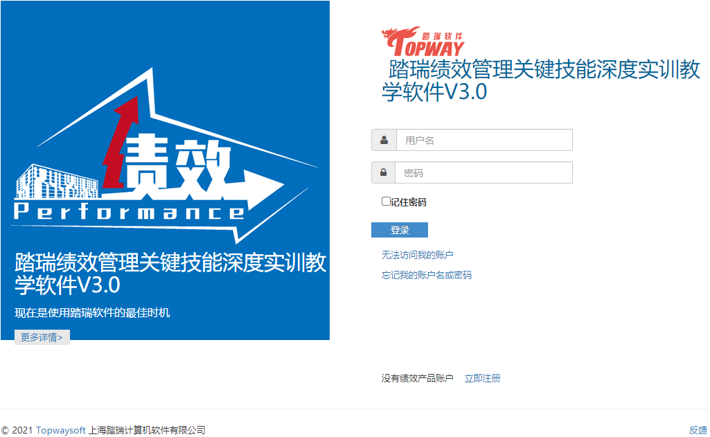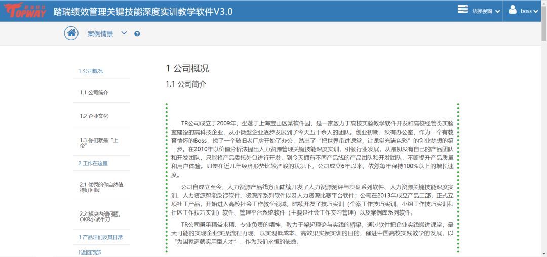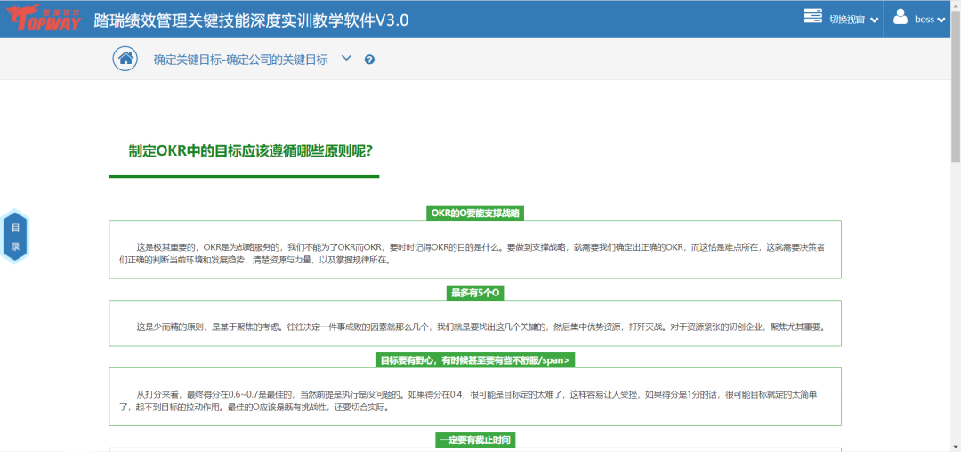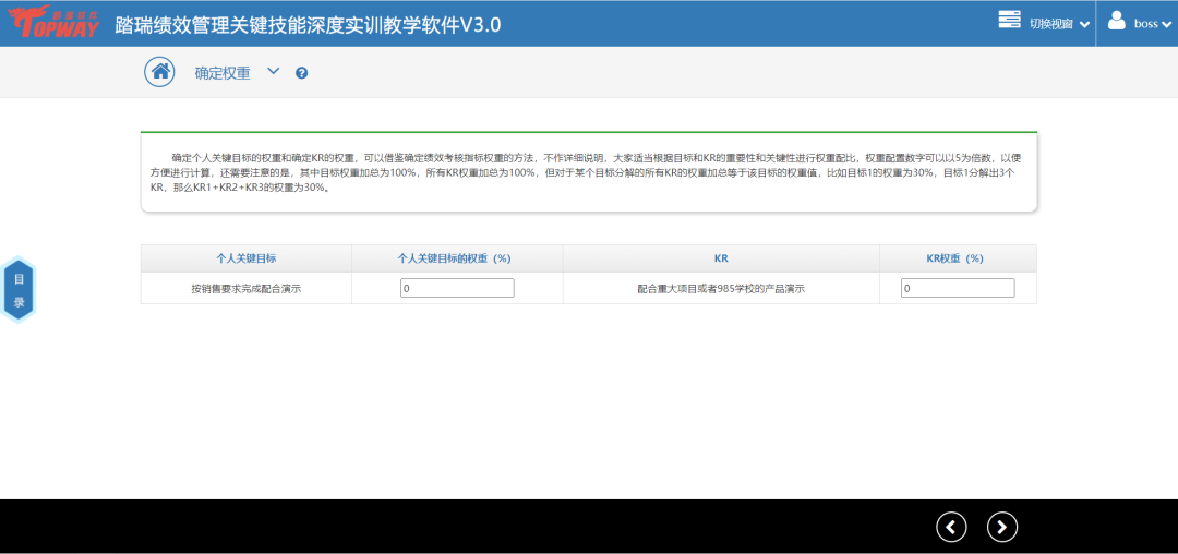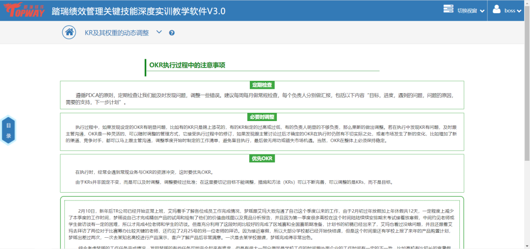 踏瑞績效管理智能反饋比賽軟件是一款緊密結合理論知識和工作實踐的績效管理課程實訓軟件。通過軟件,學生不僅能夠深度訓練常用的績效管理工具,還可以了解和練習新興的績效管理工具,例如OKR等。此外,學生還可以對績效設計要點進行充分訓練,對績效管理流程進行PDCA全過程綜合模擬。充分地將理論知識與績效管理工作的方法、工具和流程相融合。該軟件能夠充分發揮學生的主觀能動性,實現理論知識到工作實踐的高度轉化,切實達到績效管理課程“會設計”、“會執行”的教學目的。